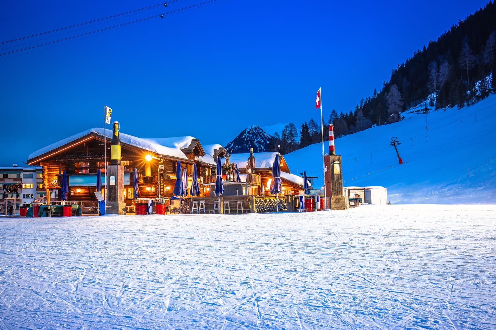 Idyllic mountain town of Davos in Swiss Alps ski slope and apres ski lodge evening view