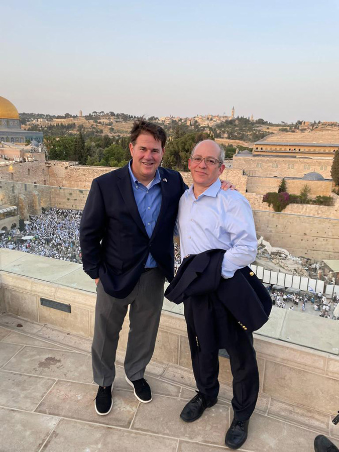 הקונסול הכללי ניומן ביחד עם מושל אריזונה בשעתו, דאג דיוסי, צופים על רחבת הכותל המערבי ביום ירושלים, בעת ביקורו של המושל בישראל
