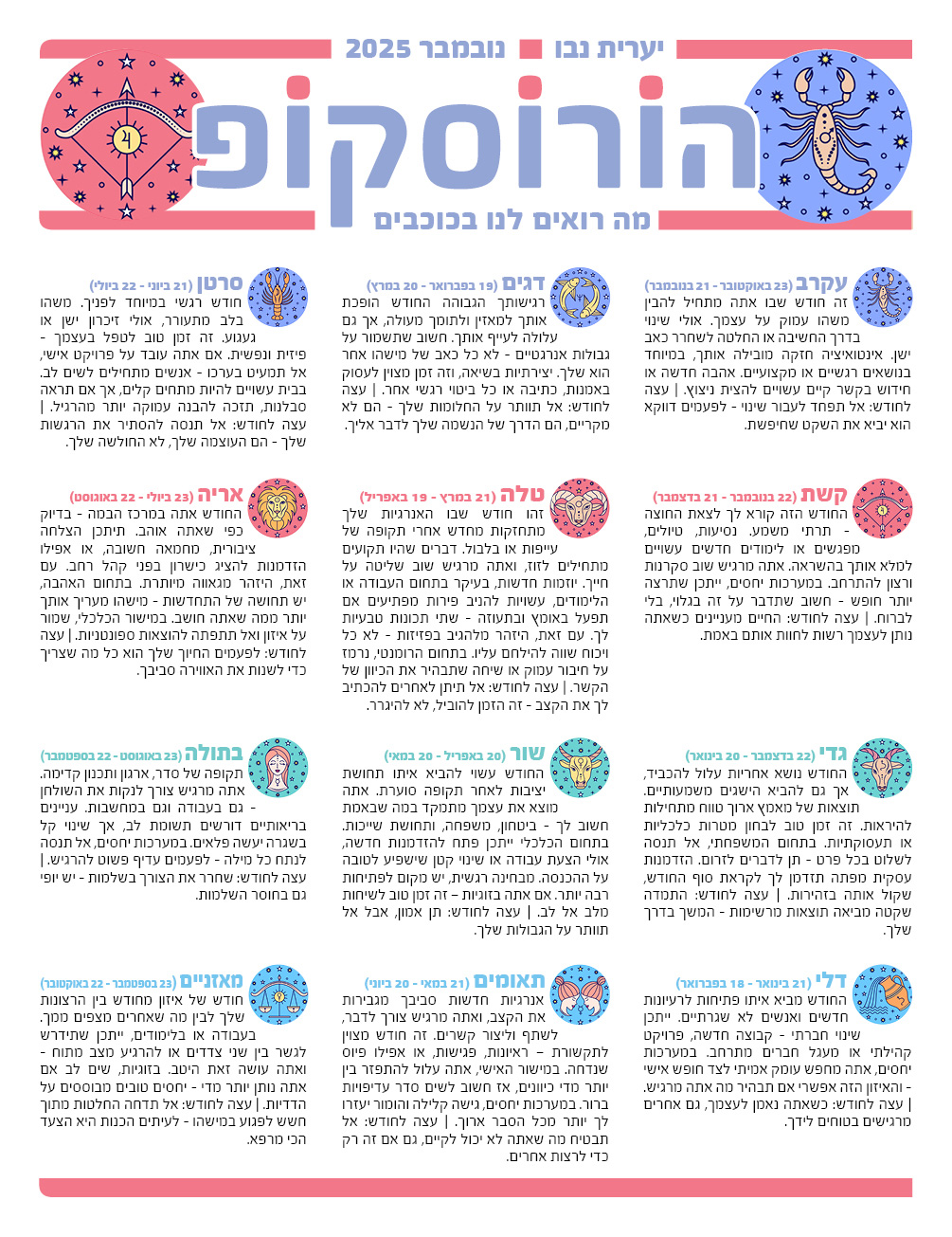 זהו חודש שבו האנרגיות שלך מתחזקות מחדש אחרי תקופה של עייפות או בלבול. דברים שהיו תקועים מתחילים לזוז, ואתה מרגיש שוב שליטה על חייך. יוזמות חדשות, בעיקר בתחום העבודה או הלימודים, עשויות להניב פירות מפתיעים אם תפעל באומץ ובתעוזה – שתי תכונות טבעיות לך. עם זאת, היזהר מלהגיב בפזיזות – לא כל ויכוח שווה להילחם עליו. בתחום הרומנטי, נרמז על חיבור עמוק או שיחה שתבהיר את הכיוון של הקשר.