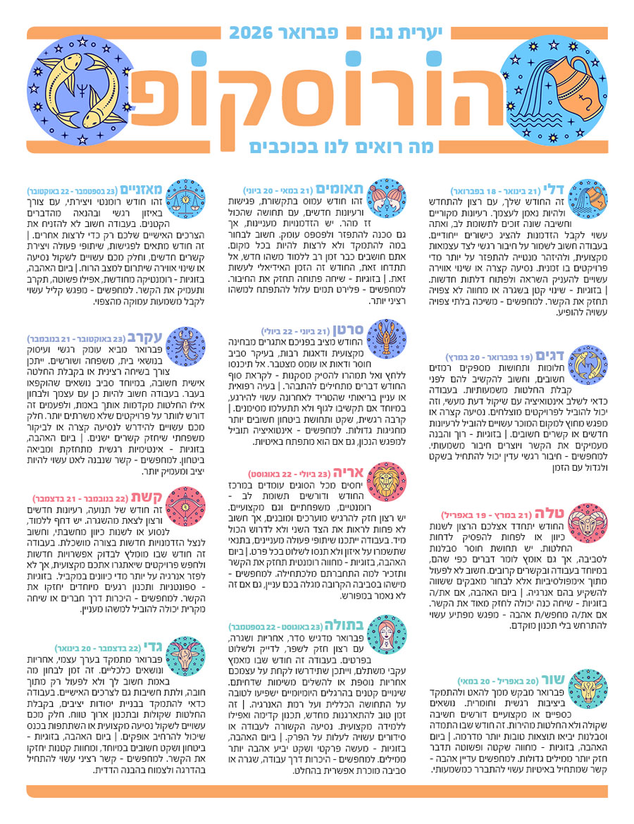 פברואר מביא עומק רגשי ועיסוק בנושאי בית, משפחה ושורשים. ייתכן צורך בשיחה רצינית או בקבלת החלטה אישית חשובה, במיוחד סביב נושאים שהוקפאו בעבר. בעבודה חשוב להיות כן עם עצמך ולבחון אילו החלטות מקדמות אותך באמת, ולפעמים זה דורש לוותר על פרויקטים שלא משרתים יותר. חלק מכם עשויים להידרש לנסיעה קצרה או לביקור משפחתי שיחזק קשרים ישנים.