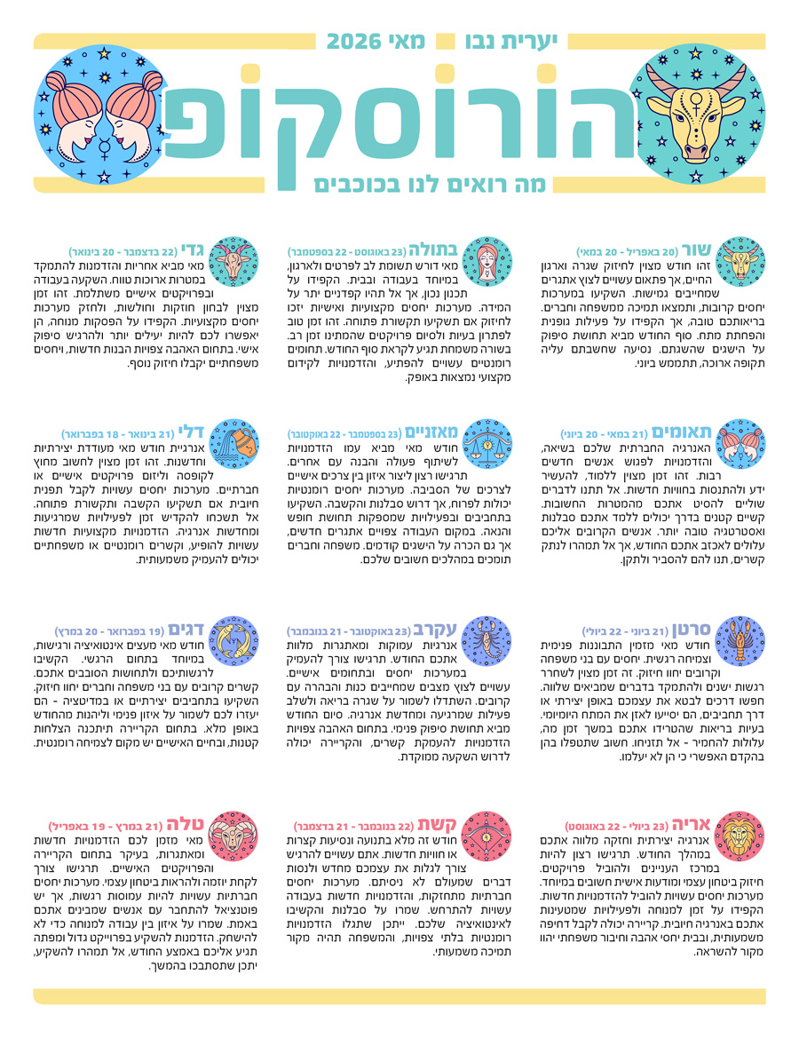 מאי מביא אחריות והזדמנות להתמקד במטרות ארוכות טווח. השקעה בעבודה ובפרויקטים אישיים משתלמת. זהו זמן מצוין לבחון חוזקות וחולשות, ולחזק מערכות יחסים מקצועיות. הקפידו על הפסקות מנוחה, הן יאפשרו לכם להיות יעילים יותר ולהרגיש סיפוק אישי. בתחום האהבה צפויות הבנות חדשות, ויחסים משפחתיים יקבלו חיזוק נוסף.