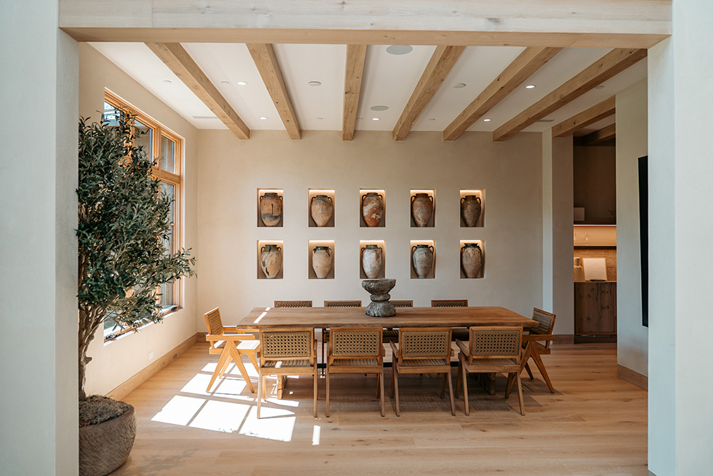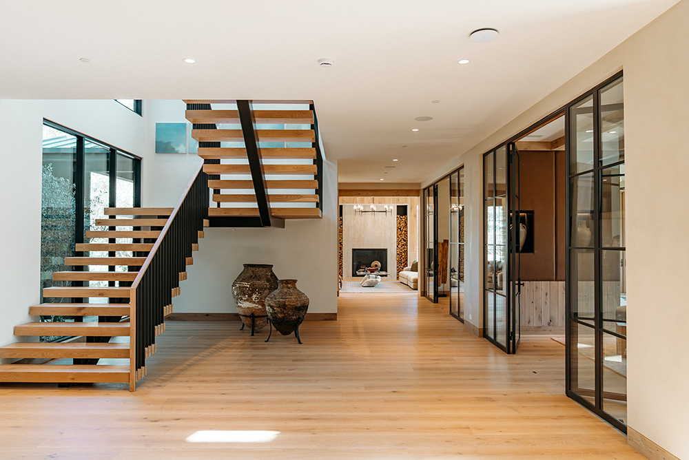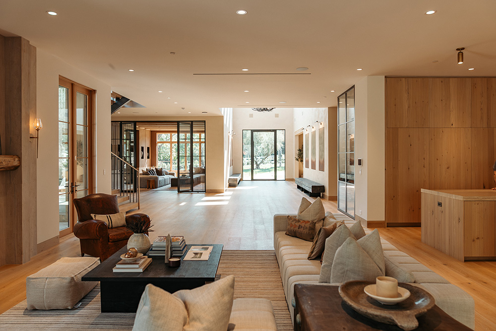 הבית המרווח עם תיקרה גבוהה בסלון וכולו רצפת עץ, כולל חדר יינות מזכוכית במרכז הבית ובריכת שחיה ארוכה.