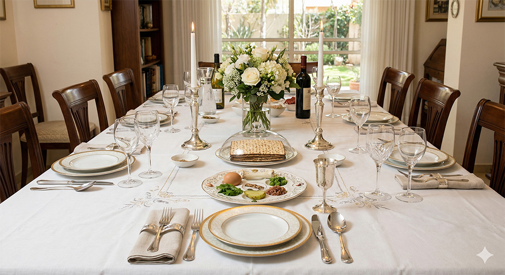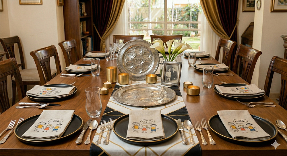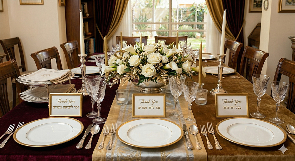 • טיפ: הוסיפו כרטיסי תודה אישיים ליד כל אורח עם ברכה קצרה או ציטוט מההגדה, מה שיהפוך את השולחן לאישי וייחודי.