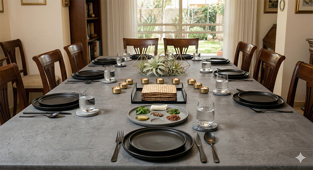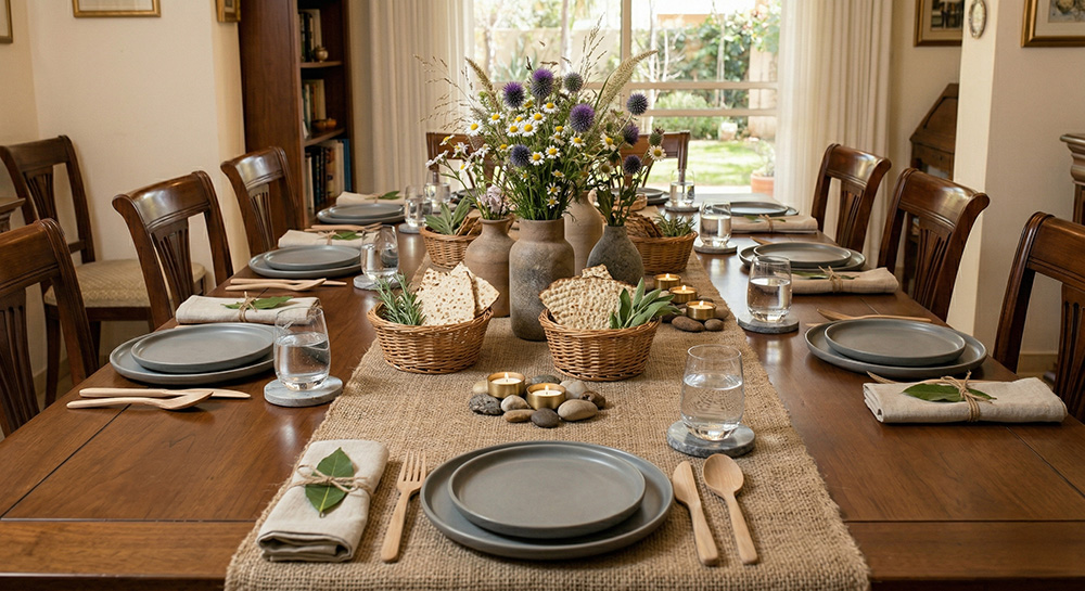 • טיפ: סדרו את המצות בצלחת קטנה יפה במרכז השולחן, והוסיפו סידור פרחים לבן או ירוק עדין כדי לשמור על תחושת ניקיון ורעננות.