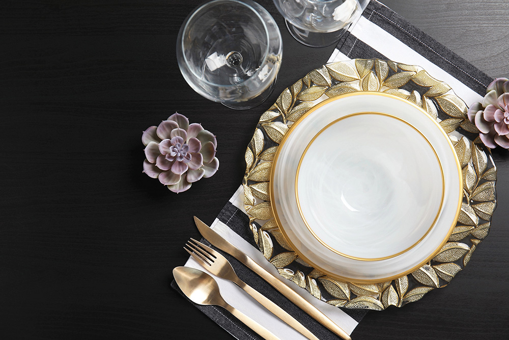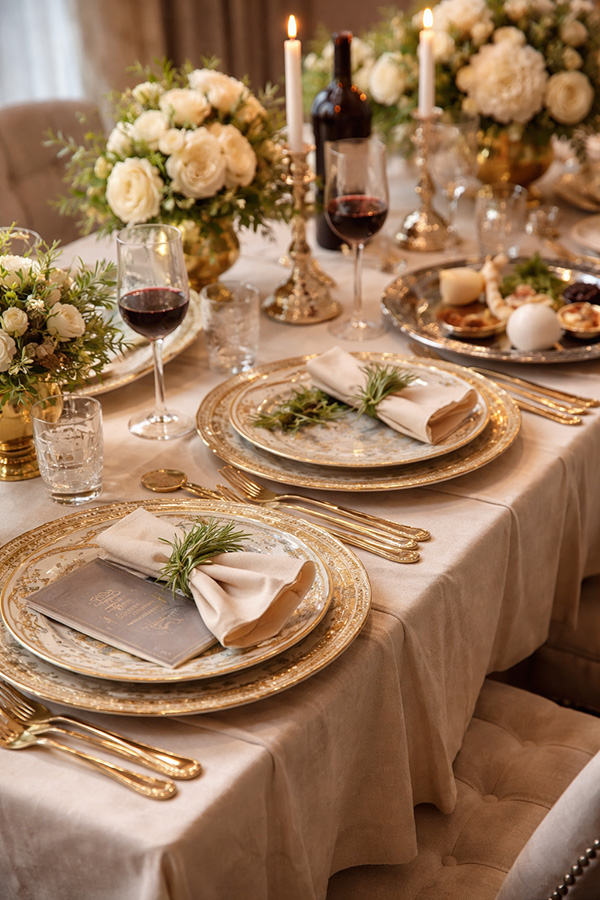 • חפצים: כלי זכוכית קריסטל, כוסות יין גבוהות, צלחות פורצלן.