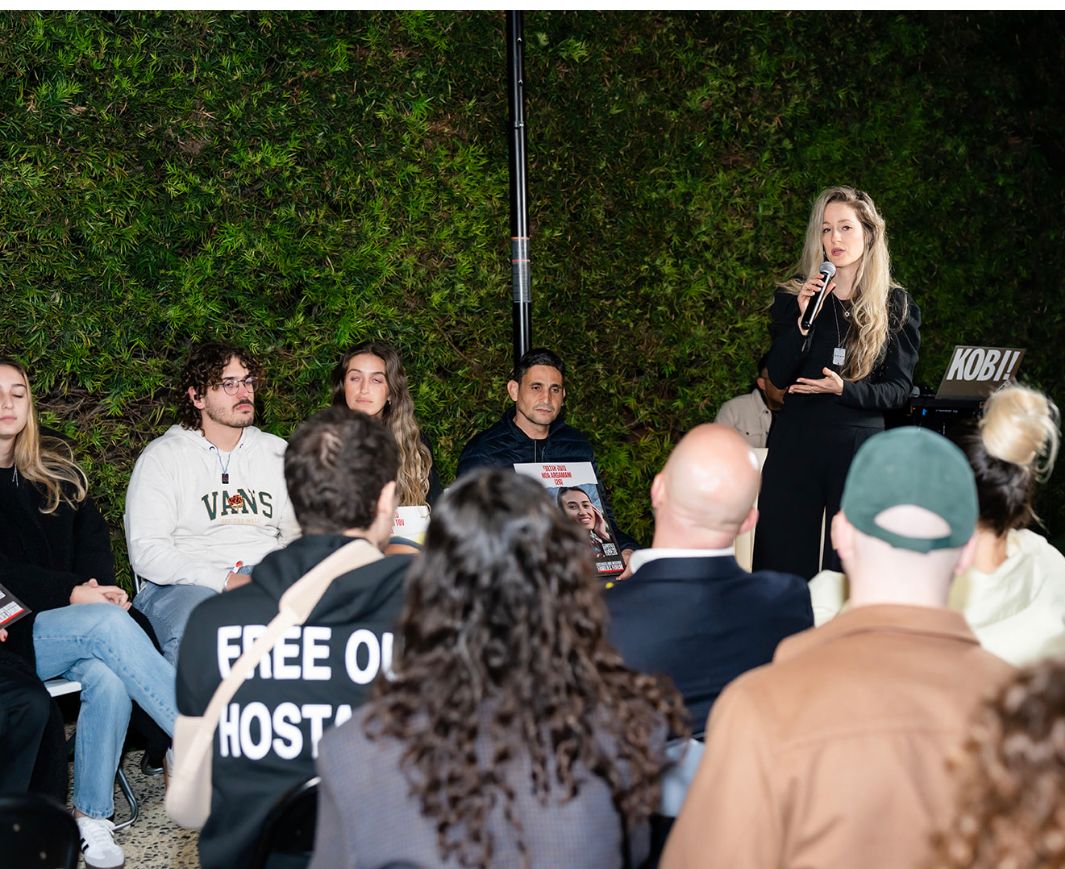 באירוע שהתקיים ב-16 בינואר בלוס אנג'לס, סיפרו בני משפחותיהם של שלושה חטופים על מה עובר עליהם מאז יקיריהם נחטפו ועל סימן החיים האחרון שקיבלו מהם. טל נבארו שארגנה את האירוע הצליחה תוך מספר ימים לארגן את האירוע בבית פרטי, אנשים טובים התנדבו להביא כיסאות ומחממים ואורחים הוזמנו. הערב התחיל עם פאנל בהשתתפות משפחותיהם של רון בנימין, 53, נועה ארגמני, 26 ועומר שם טוב שנחטפו ב-7 באוקטובר על ידי חמאס. באירוע השתתף גם השחקן ולוחם סיירת מטכ"ל ידין גלדמן שנפצע קשה וסיפר על מה שעבר באותו יום נורא ועל חברו דוד מאיר שנהרג. "אני ודוד צוותנו יחד כצמד ברזל, הדבר האחרון שאמרנו אחד לשני זה, נתנו מכה על הקסדה ואמרנו, 'אני שומר עליך ואתה שומר עליי'". "המטרה היתה להביא אנשים שאינם יהודים או ישראלים לשמוע את הסיפורים ולהביא למודעות" מספרת טל. "הרבה אנשים לא באמת יודעים מה קרה שם וזה חשוב להעלות את נושא המאבק להחזרתם הביתה". | צילם: ירין דרשן
