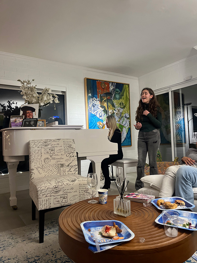 שושן, מי שהיתה מלכת היופי של ישראל, ביקשה ללמד את האורחים הלא יהודים על חג האורים שהשנה נפל באותו יום כמו חג המולד. המלחינה שרון פרבר ליוותה בפסנתר את בתה הזמרת עדן בת ה-13. עדן זמרת מוכשרת המופיעה כבר שנים באירועים ולאחרונה במחזמר "כנר על הגג", שרה מחרוזת שירים בעברית ואנגלית.