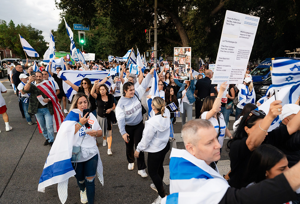 ימים מספר לאחר התקפת הטרור הקשה ביותר על ישראל מאז הקמתה, (מספר הנרצחים: 1,410 מתוכם 1080 אזרחים. פצועים: 4,834 וחטופים: 230), התארגנו מספר עצרות הזדהות עם ישראל בלוס אנג'לס. בעצרת שהתקיימה מחוץ לבניין הפדרלי בווסטווד, השתתפו מאות מפגינים שהניפו דגלי ישראל. העצרת שנערכה בחסות StandWithUs, נערכה לאחר מסיבת עיתונאית בבניין העירייה בלוס אנג'לס בה עמדו חברי מועצה ומנהיגי הקהילה היהודית שתיארו את המלחמה כ"אלימות תאתנית ודתית" ו"מתקפה על הדמוקרטיה בכל מקום".
