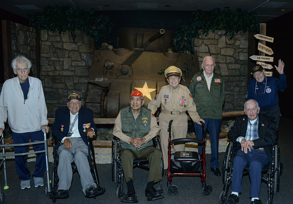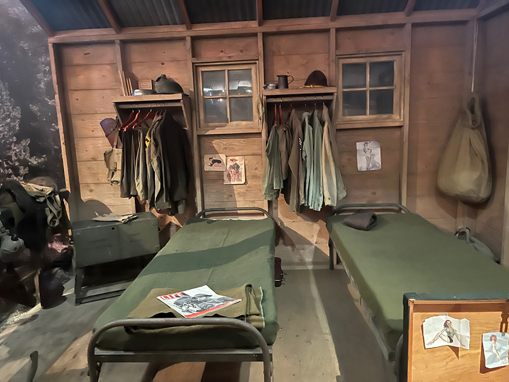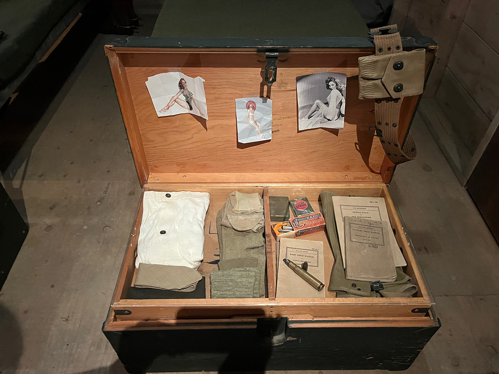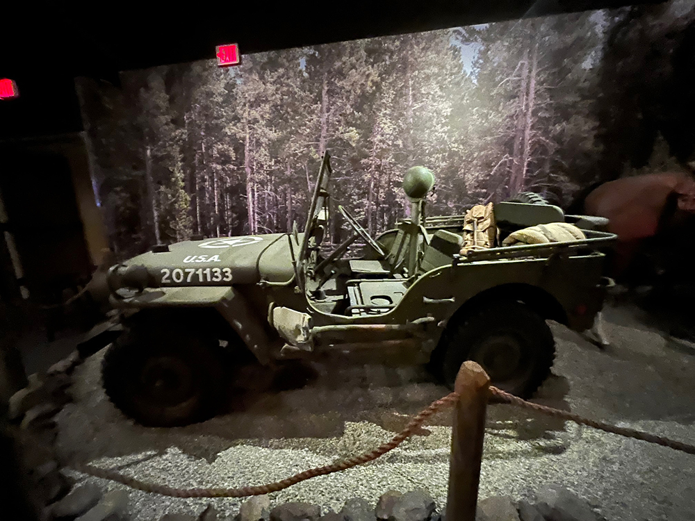 בין המוצגים: מטוס חיפוש והצלה גרמני, טנק שרמן אמריקאי, שברי פצצות יפניות ששימשו בהתקפה על דרום קליפורניה, רובים, אקדחים, ספרי תורה קטנים שהצילו לא פעם את חייהם החיילים כשקליע פגע בהם ולא חדר דרכם, מכשירי מורס וכתיבה.