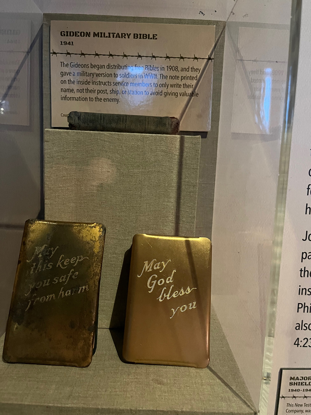 לצד כל חפץ תוכלו לקרוא את הסיפורים המתלווים אליהם והם לא פחות ממדהימים. לצד תמונתו של ד"ר בן סלומון, תוכלו לקרוא כיצד כיצד הרופא היהודי שנולד במילווקי וויסקונסין גוייס לחיל הרגלים של צבא ארה"ב. במאי 1943 הוא שירת בתור רופא שיניים וקודם לדרגת סרן. ביוני 1944 בהיעדר צורך ברופא שיניים בזמן הקרבות, התנדב סולומון להחליף את המנתח הפצוע של הגדוד השני על חופי האי סאיפאן. ביולי הוקמה תחנת הטיפול של סולומון כ-50 מטרים מאחורי השוחה הקדמית. האוהל החל להתמלא בפצועים שזרמו מהקרב והחיילים יפנים החלו לחדור לתוכו. סלומון שהבחין בחייל יפני מנסה לחסל פצוע אמריקאי ששכב על מיטה, מיהר לחסלו וכשחיילים יפנים נוספים החלו לחדור לאוהל, הוא הורה לפצועים לעזוב והוא נשאר מאחור לחפות על נסיגתם. כשחיילים אמריקאים חזרו מקום מספר ימים לאחר הקרב, הם מצאו את גופתו של סרן סולומון שמוטה על מכונת ירייה מול עמדת הירי היו מוטלות גופותיהם של 98 חיילים יפנים אותם חיסל. גופתו של סלומון היתה מנוקבת ב-76 כדורים ובדקירות כידון מרובות.