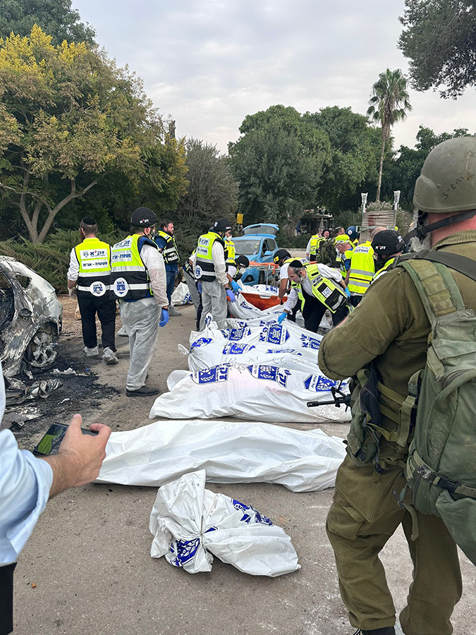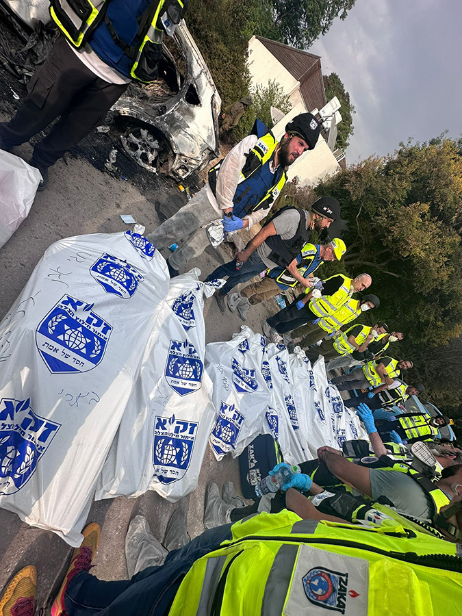 "הגופה הראשונה היתה של מישהי שירו לה בפנים עד שלא נשאר שום דבר, פשוט המשיכו לירות גם לאחר שנהרגה. הגענו למקום ביום שני בבוקר ועד אז הגופות כבר היו נפוחות ועם תולעים. הגופות היו מפוזרות בכל מקום, בחוץ ובבתים, לחלקן נכרתו איברים, אצבעות, רגליים, ידיים, עין. היה ברור שהם עברו עינויים קשים לפני שנורו או נשרפו חיים. ראיתי אמא מחבקת את בנה הקטן בניסיון להגן עליו ושניהם נשרפו, היה זוג ששרפו אותם ביחד אך הגופה של הגבר לא נישרפה כליל ואפשר היה לראות עדיין את ההצלפות הקשות על גבו של הגבר. ראיתי תינוק עם גרזן בתוך הראש. בכלל, היו שם הרבה תינוקות עם ראשים ערופים. מתנדבי זק"א שרגילים לאסוף גופות אחרי פיגועים ואסונות הלכו הצידה להקיא, חלקם התעלפו. החבר שהביא אותי לשם, מתנדב כבר 25 שנה, הוא בראש הצוות של המשלחת הבינלאומית והספיק להיות בזירות אסונות כמו בתורכיה, האיטי והוא אמר שדבר כזה לא ראה מעולם. האכזריות של חמאס זיעזעה את כולנו. באחד הממד"ים מצאנו גבר כבן 50 שמת משאיפת עשן. הוא הרג 15 מחבלים ולאחר שנתפס בסופו של דבר, הם כרתו לו את כל אצבעות הידיים, הוא הצליח להמלט איכשהו, ברח לממ"ד ושם מת משאיפת עשן לאחר שהם שרפו את המקום. מצאנו באזור את גופות המחבלים שהרג".