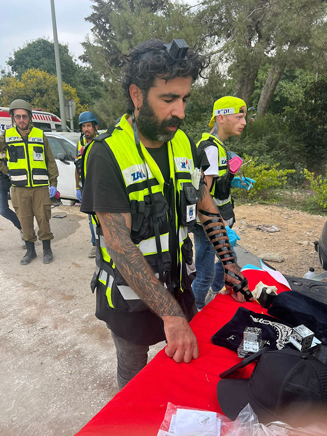 תומר, אמן במקצועו המתעסק גם באופנה, מספר: "ביום שישי, לפני שהכל התחיל, ישבתי עם חברה' מהיחידה שלי, אכלנו, שתינו החלפנו חוויות ולמחרת היום, יום שבת כבר גייסו אותם. מאחר ולאחר השירות שלי אובחנתי עם PTSD שיחררו אותי ממילואים, אבל הרגשתי שאני לא יכול לשבת בבית ולא לעשות כלום. אז התקשרתי לחבר שלי שמתנדב בזק"א כבר 25 שנים וביקשתי להתנדב, ביום שני כבר הגעתי אתם לנחל עוז בבארי והעברתי את כל השבוע אתם, אוסף גופות".