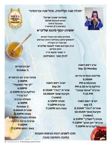ותפילת ערבית צאת החג 7:24PM יום א׳ ראש השנה